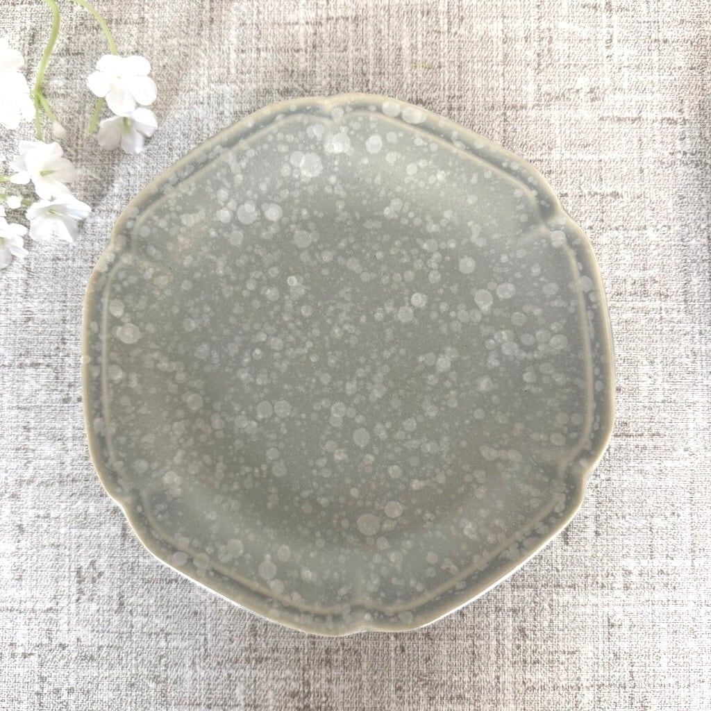 優しいグレーに白い釉の斑点が広がりマットな質感で落ち着いた雰囲気です♪